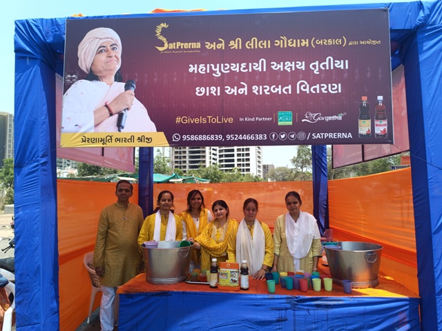 અમદાવાદ, ગુજરાત | ૨૦ એપ્રિલ ૨૦૨૬ — 19 એપ્રિલ 2026ના રોજ અક્ષય તૃતીયા પર્વ નિમિત્તે સત્પ્રેરણા ટ્રસ્ટ તથા શ્રી લીલાગૌધામ દ્વારા ‘અક્ષય ભારત કલશ અભિયાન’ અંતર્ગત ભવ્ય સેવા કાર્યનો પ્રારંભ કરવામાં આવ્યો છે. પ્રેરણામૂર્તિ ભારતી શ્રીજીના માર્ગદર્શન હેઠળ અને ટ્રસ્ટના માર્ગદર્શન સાથે છેલ્લા 11 વર્ષથી ચાલી રહેલી આ પરંપરામાં આ વર્ષે સમગ્ર ગુજરાતમાં 30,000 લીટરથી વધુ કેસુડાનો શરબત તથા 7,500 લીટર ગીરગાયની શુદ્ધ છાશનું નિઃશુલ્ક વિતરણ કરવામાં આવી રહ્યું છે.