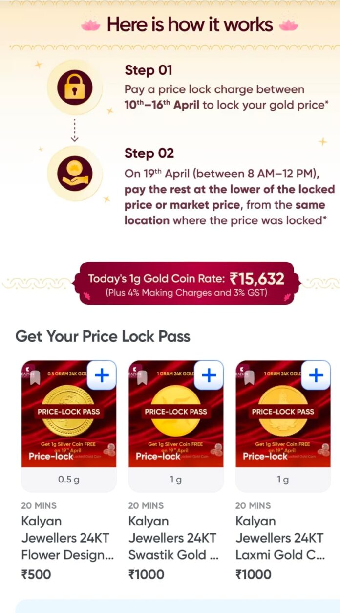 10 એપ્રિલથી 16 એપ્રિલ, 2026 દરમિયાન, ગ્રાહકો ઇન્સ્ટામાર્ટ એપ પર કલ્યાણ જ્વેલર્સ સોનાના સિક્કા પસંદ કરી શકે છે અને અક્ષય તૃતીયા પર પ્રી-બુક કરવા અને ડિલિવરી લેવા માટે ₹500 થી શરૂ કરીને 5% એડવાન્સ ચૂકવી શકે છે. 119 એપ્રિલના રોજ, સવારે 8:૦૦ થી બપોરે 12:૦૦ વાગ્યા સુધી, તેઓ બે કિંમતોમાંથી નીચા ભાવે ખરીદી પૂર્ણ કરે છે – પ્રી-બુકિંગના દિવસે સોનાનો ભાવ અથવા ડિલિવરી તારીખ મુજબ, જે પણ ઓછું હોય તે મુજબ ખરીદી કરી શકશે. બધા પ્રી-બુક ગ્રાહકોને કલ્યાણ જ્વેલર્સ તરફથી મફત ચાંદીનો સિક્કો પણ મળશે.
