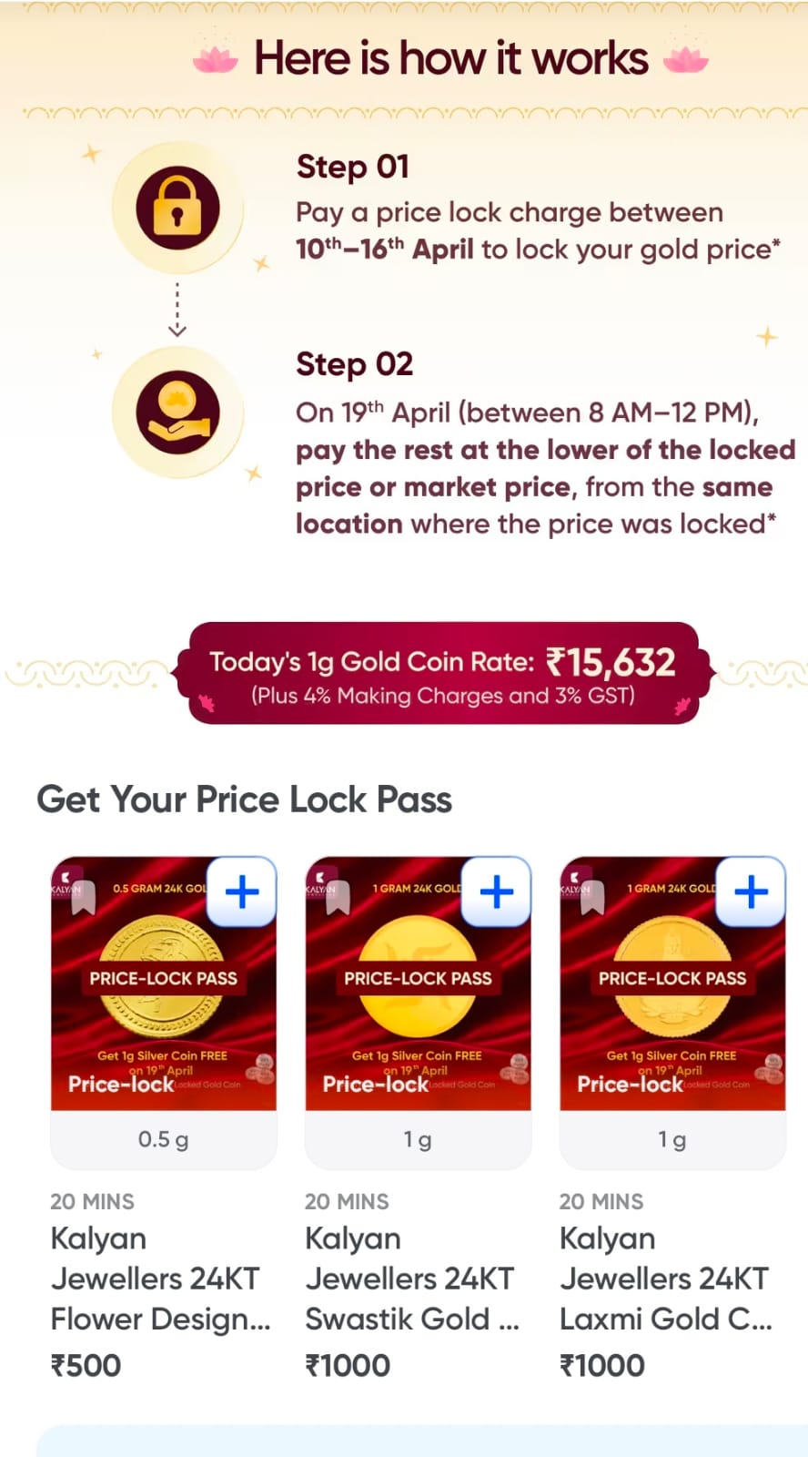 ગોલ્ડ પ્રાઈસ લોક એ ઇન્સ્ટામાર્ટ પર સૂચિબદ્ધ પસંદગીના કલ્યાણ જ્વેલર્સ ઉત્પાદનો પર મર્યાદિત સમયગાળાની વિક્રેતા-આધારિત ઓફર છે. પ્રાઇસ-લોક ચાર્જ જરૂરી છે અને 19 એપ્રિલ, 2026 ના રોજ સવારે 8:00 થી બપોરે 12:00IST વચ્ચે કરવામાં આવેલી અંતિમ ખરીદી સામે આપવામાં આવશે. અંતિમ કિંમત લોક્ડ રેટ અથવા પ્રવર્તમાન બજાર દર કરતાં ઓછી હશે. મફત ચાંદીના સિક્કા સહિતની ઓફર ઉપલબ્ધતા અને વધારાના નિયમો અને શરતોને આધીન છે.
