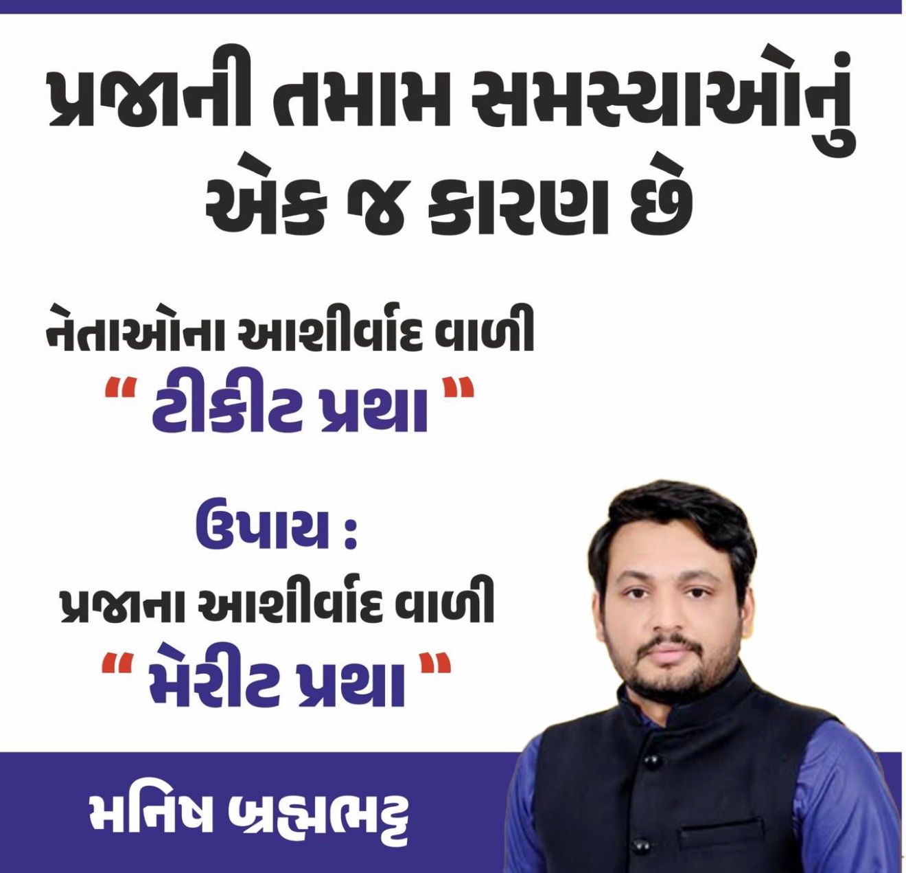 હું મનીષ બ્રહ્મભટ્ટ, ૨૦૧૧માં અન્ના આંદોલન ગુજરાતનો કન્વીનર હતો. અરવિંદ કેજરીવાલ સાથે અમે બહુ નજીકથી કામ કરેલું. આમ આદમી પાર્ટીનો આઈડિયા પણ ગુજરાતનો અને અમારો આઈડિયા હતો. અમે એમને કહ્યું હતું કે ચૂંટણીને જ આંદોલનનું રૂપ આપવું પડશે અને ‘સ્વરાજ’ નો કાયદો લાવવો પડશે. પરંતુ અરવિંદ કેજરીવાલ સત્તાના હવસખોર અને લાલચુ નીકળ્યા. એમણે પ્રજાની સરકારના બદલે ‘કેજરીવાલની સરકાર’ બનાવી દીધી. એમણે ૨૦૧૪માં રૂપિયા લઈને ટિકિટો આપવાની શરૂઆત કરી. અરવિંદ કેજરીવાલ આઝાદ ભારતના સૌથી મોટા વિશ્વાસઘાતી નેતા છે. એમણે ‘સ્વરાજ’ નો કાયદો પંજાબમાં પણ લાગુ ન કર્યો. હું ગુજરાતના લોકોને અપીલ કરું છું કે કેજરીવાલનો ભરોસો કરતા નહીં, એ ગુજરાતના યુવાનોનો માત્ર સત્તા મેળવવા ઉપયોગ કરી રહ્યા છે. એમણે મફતની લહાણી કરીને પ્રજાધ્રોહ કર્યો છે, જ્યારે પ્રજાને તો ‘સ્વરાજ’ અને પોતાની મરજી મુજબની વ્યવસ્થા જોઈતી હતી.