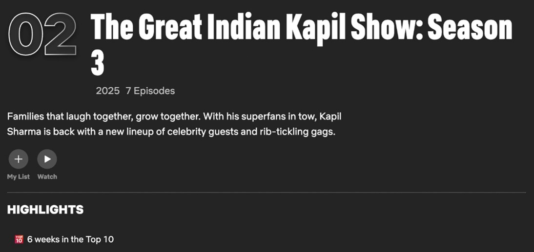 કપિલ શર્માએ કોમેડીની ધૂમ મચાવવાનું ચાલુ રાખ્યું છેઃ ધ ગ્રેટ ઈન્ડિયન કપિલ શોએ લાગલગાટ છ સપ્તાહ સુધી નેટફ્લિક્સ ઈન્ડિયાના ટોપ 10માં સ્થાન જમાવી રાખ્યું છે