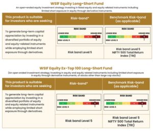 WSIF ઇક્વિટી લોંગ-શોર્ટ ફંડનો હેતુ વિવિધિકૃત ઇક્વિટી પોર્ટફોલિયો દ્વારા લાંબા ગાળાની મૂડી વૃદ્ધિ કરવાનું છે, જેને પસંદગીના શોર્ટ પોઝિશન્સ દ્વારા પૂરક બનાવવામાં આવે છે। આ વ્યૂહરચના ઇક્વિટીમાં મુખ્ય ફાળવણી (80–100%) જાળવે છે, સાથે સાથે ડેરિવેટિવ્સ દ્વારા મહત્તમ 25% સુધી અનહેજ્ડ શોર્ટ એક્સપોઝર લેવાની લવચીકતા આપે છે। ઉપરાંત, લિક્વિડિટી જાળવવા માટે ડેટ અને મની માર્કેટ ઇન્સ્ટ્રુમેન્ટ્સમાં ટેક્ટિકલ ફાળવણી પણ કરવામાં આવે છે।