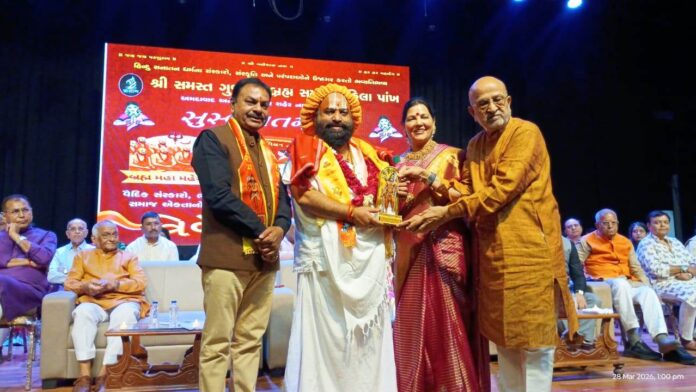 અમદાવાદ, ગુજરાત | ૩૦ માર્ચ ૨૦૨૬ — શહેરના પંડિત દિનદયાળ હોલ ખાતે તા. 28 માર્ચ શનિવારના રોજ હિન્દુ સનાતન સંસ્કૃતિને ઉજાગર કરતો અલૌકિક કાર્યક્રમ યોજાયો હતો. આ કાર્યક્રમમાં સમગ્ર ગુજરાતની મહિલાઓ જે ક્યારેય સ્ટેજ પર આવ્યા નથી તેવી મહિલાઓએ પોતાના સોળ સંસ્કાર દ્વારા આ કાર્યક્રમને જીવંત કર્યો હતો. તમને જણાવીએ કે, સમસ્ત ગુજરાત બ્રહ્મ સમાજ મહિલા પાંખ દ્વારા અમદાવાદ અને ગાંધીનગર શહેરના સહયોગથી આ “ત્રિવેણી સંગમ” કાર્યક્રમનું આયોજન કરવામાં આવ્યું હતું. આ કાર્યક્રમ સંસ્કૃતિ ઉત્સવ સંસ્કાર, અભિવ્યક્તિ અને સમાજ એકતાનો અદભૂત સંગમ બન્યો હતો. “ત્રિવેણી સંગમ” કાર્યક્રમ એ માત્ર બ્રહ્મસમાજ પૂરતો જ મર્યાદિત નથી, પરંતુ સમગ્ર સનાતન હિંદુ ધર્મના મૂલ્યો અને પરંપરાઓને ઉજાગર કરતો મહોત્સવ છે. આ કાર્યક્રમમાં વિવિધ સમાજના આગેવાનો, મહાનુભવો અને ધર્માચાર્ય મહામંડલેશ્વર, પરમ પૂજ્ય શ્રી અખીલેશ્વરદાસજી મહારાજ, પરમ પૂજ્ય શ્રી ચૈતન્ય શંભુ મહારાજ, અને પરમ પૂજ્ય શ્રી ઘનશ્યામજી મહારાજ ઉપસ્થિત રહ્યા હતા.